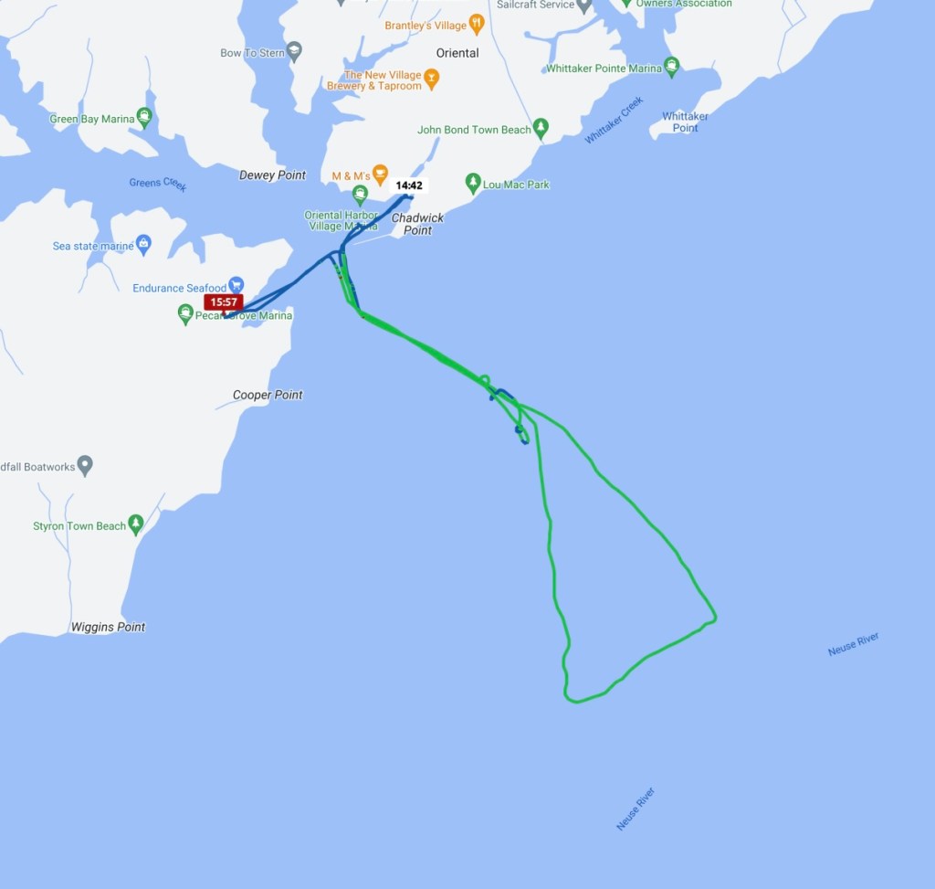 The first cruise was a short jaunt out of Oriental, NC. On board was myself and my broker, Jim Edwards. We went over to the fuel dock to add diesel and then tested aquamaps and auto pilot in the Neuse river. See below:
